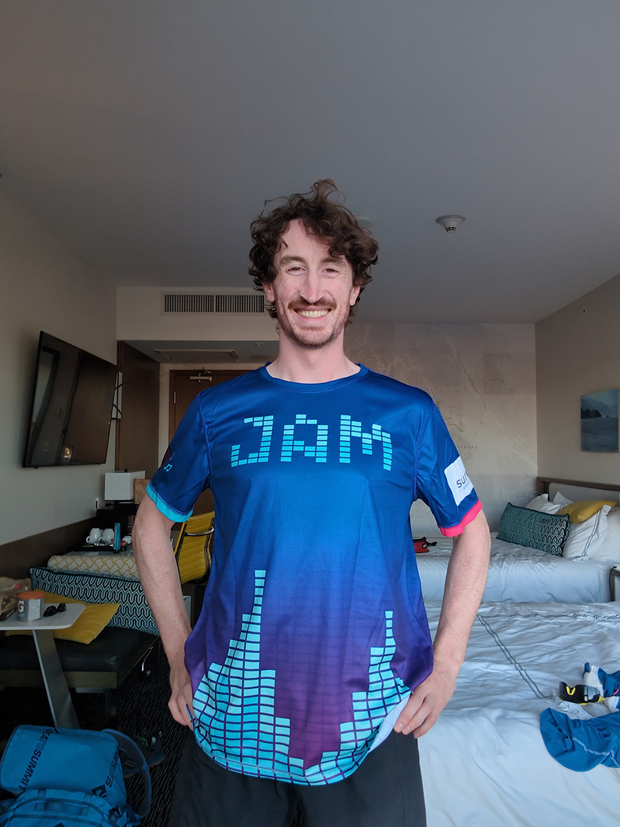 The two images below show me wearing the actual jerseys, a couple days after they had been printed (and before they had been played in!) As you can see, there are some slight differences between the mockup versions and the final versions. The team decided they wanted the dark jersey to be blue instead of purple, so we used the purple colour as a slight gradient behind the music bars to provide some contrast. We also added the asymmetrical cuffs to the dark jersey to match the light.